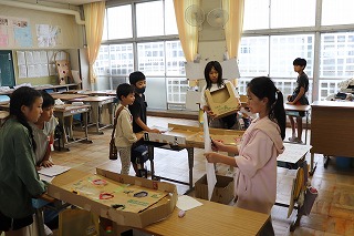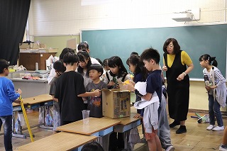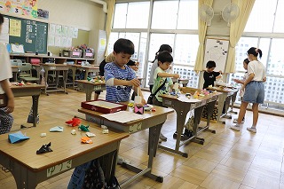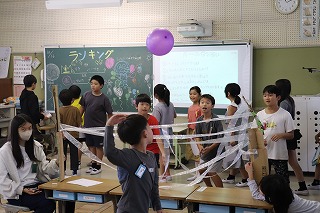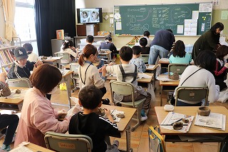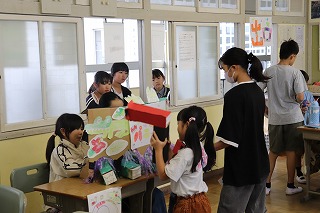 高学年の児童は低学年の児童に校舎内を案内したり、どのブースを