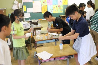 室内では、図書委員会は学級文庫の整理整頓、給食委員会は、配膳台磨きなど