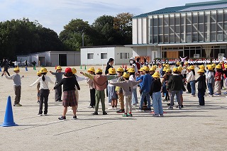 訓練放送が大放課中に流れ、児童は教室、廊下、運動場など